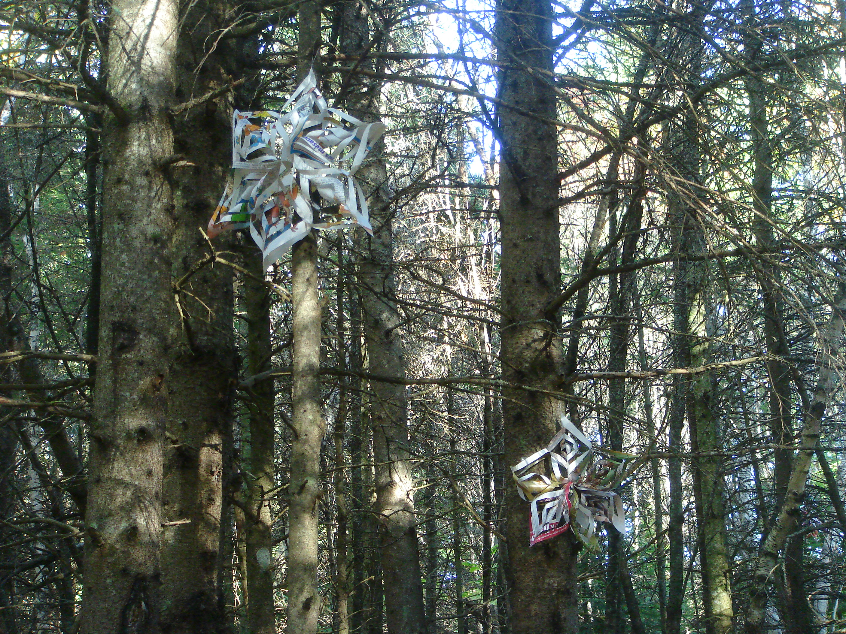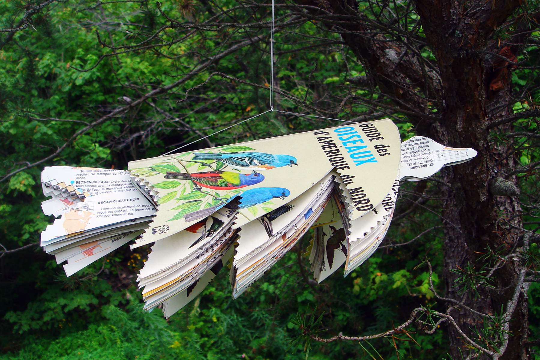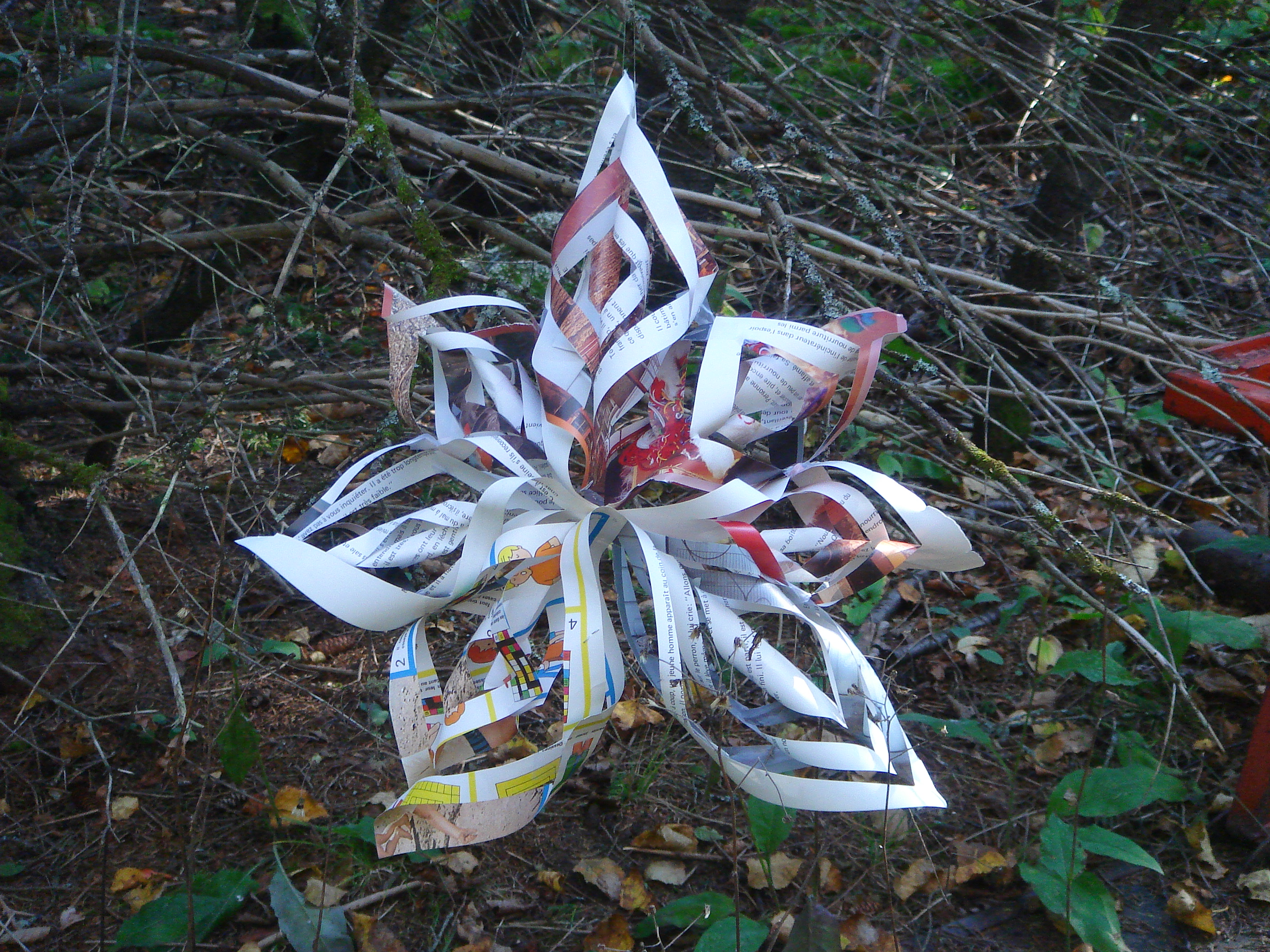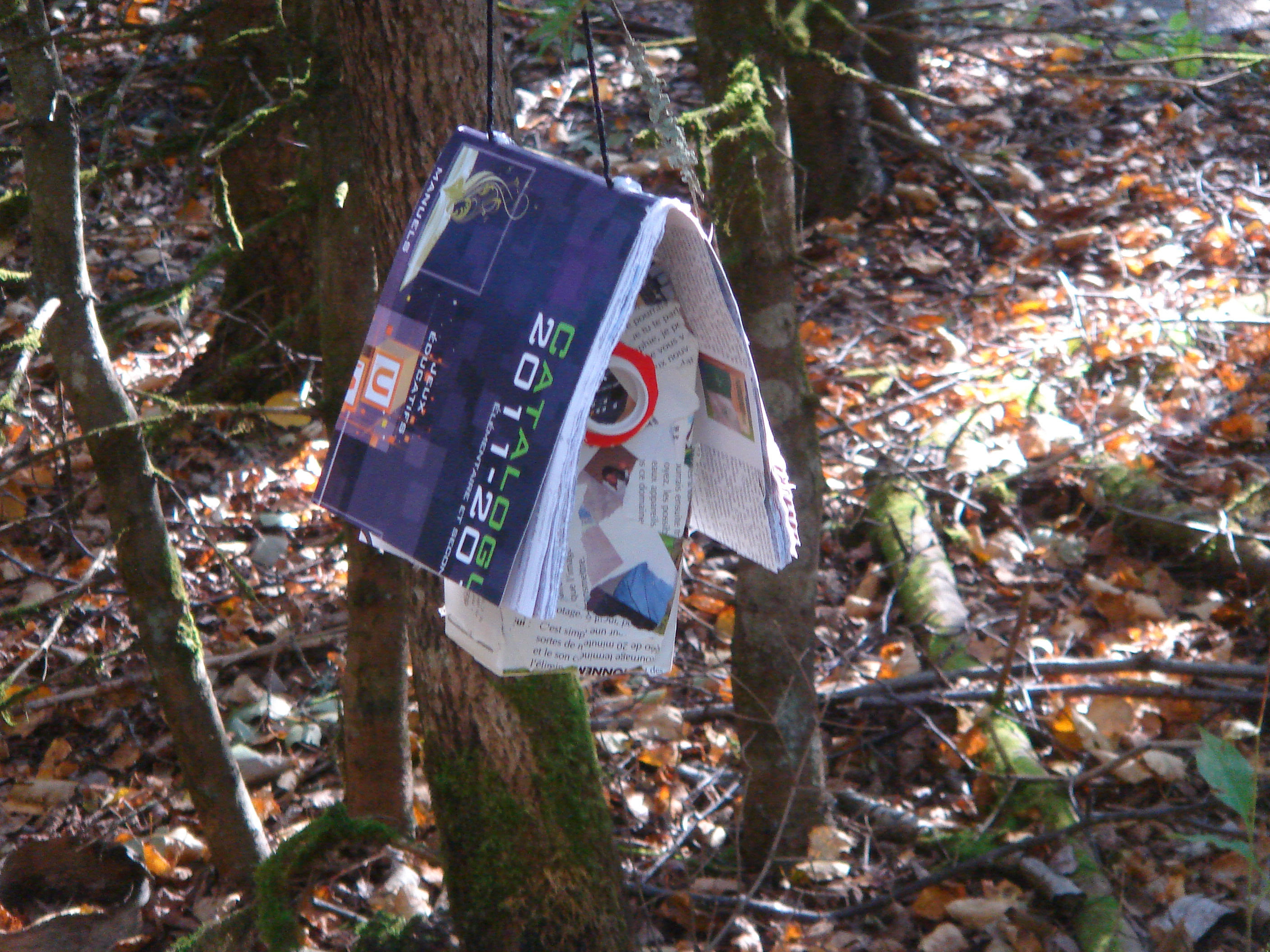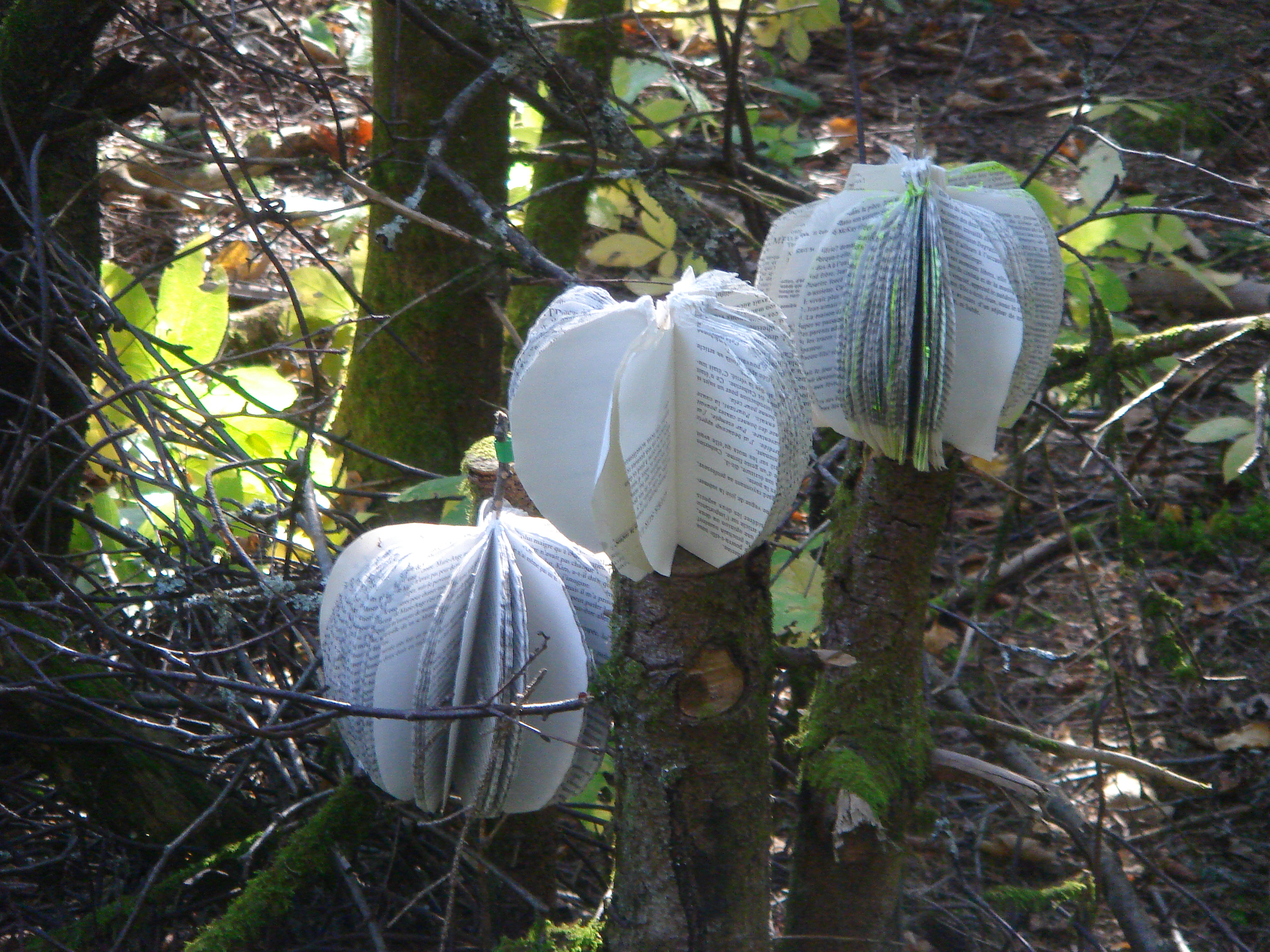 Toute la population était invitée à exposer une œuvre réalisée à partir de livres voués à la récupération dans le sous-bois près de la salle d’exposition. Seule consigne: il fallait qu’il y ait au moins un livre ou un morceau de livre dans l’installation.