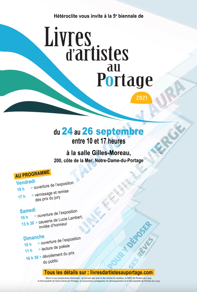 L’exposition 2021 a eu lieu les 24, 25, 26 septembre. C’était la cinquième biennale de Livres d’artistes au Portage.