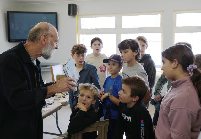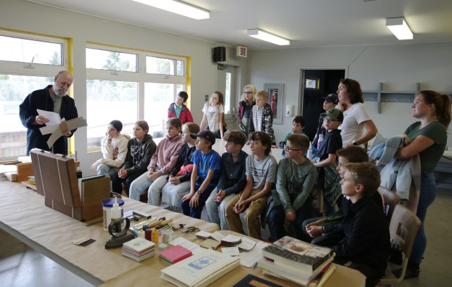 Fernand Pelletier, relieur, reçoit les enfants de l’école du Portage.